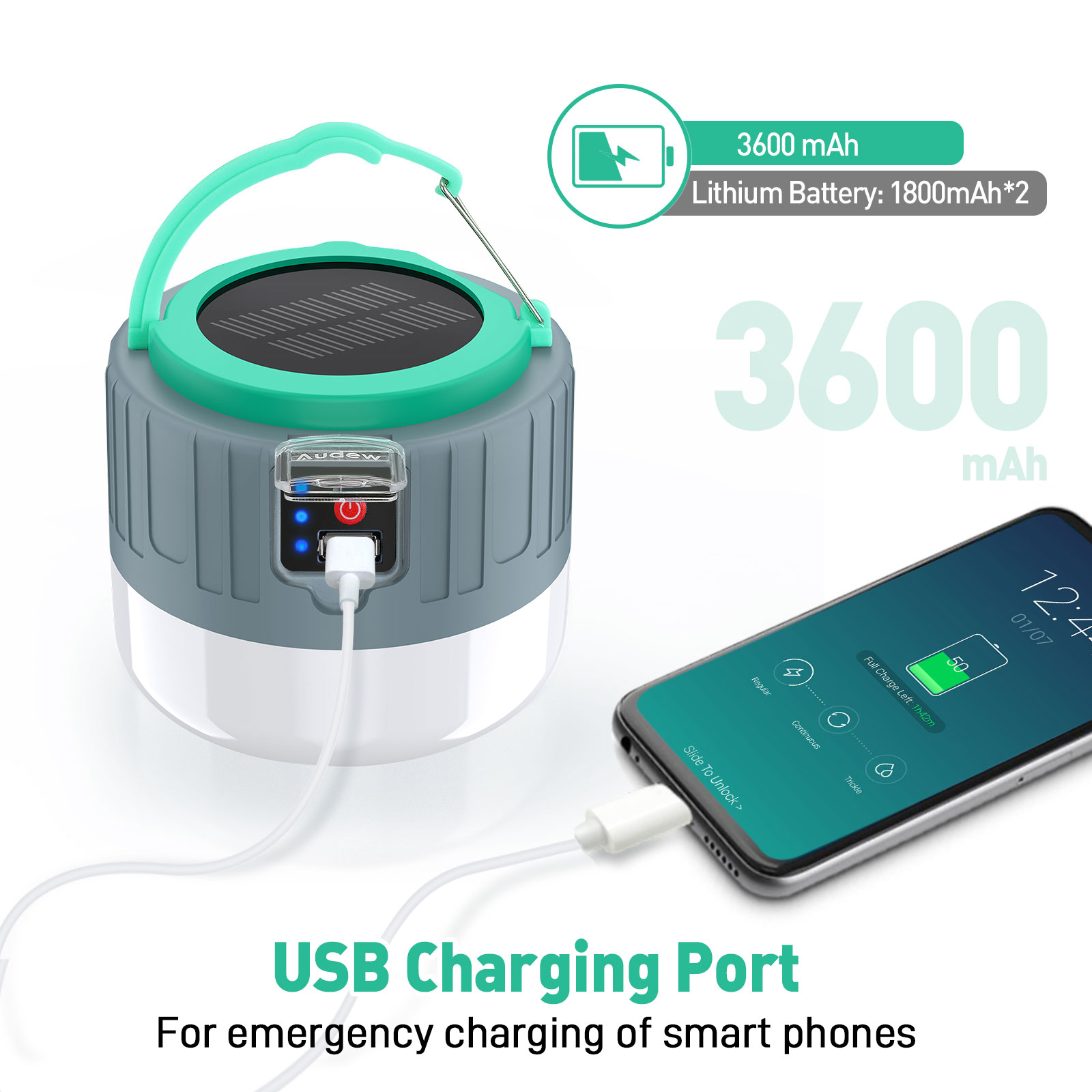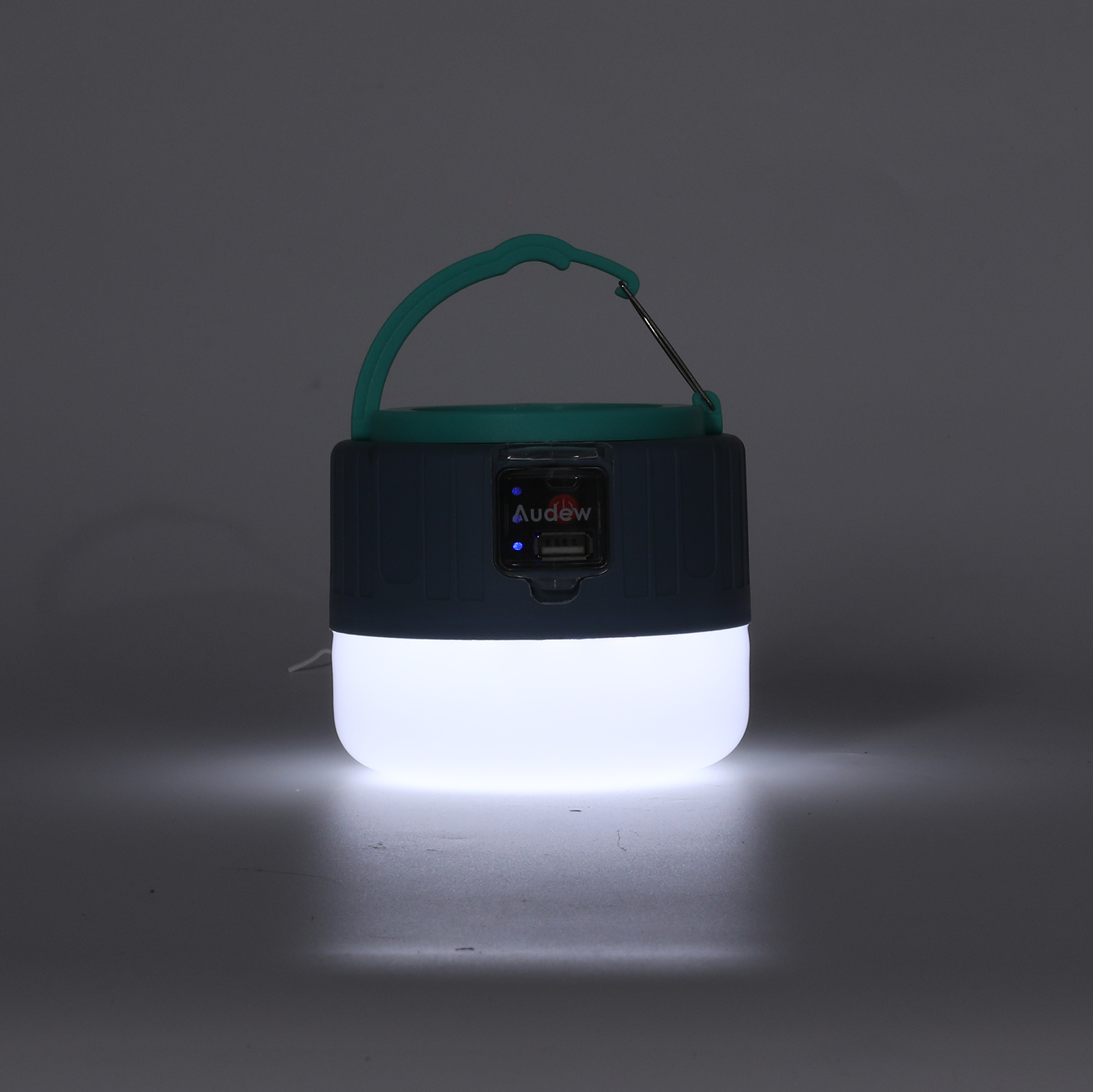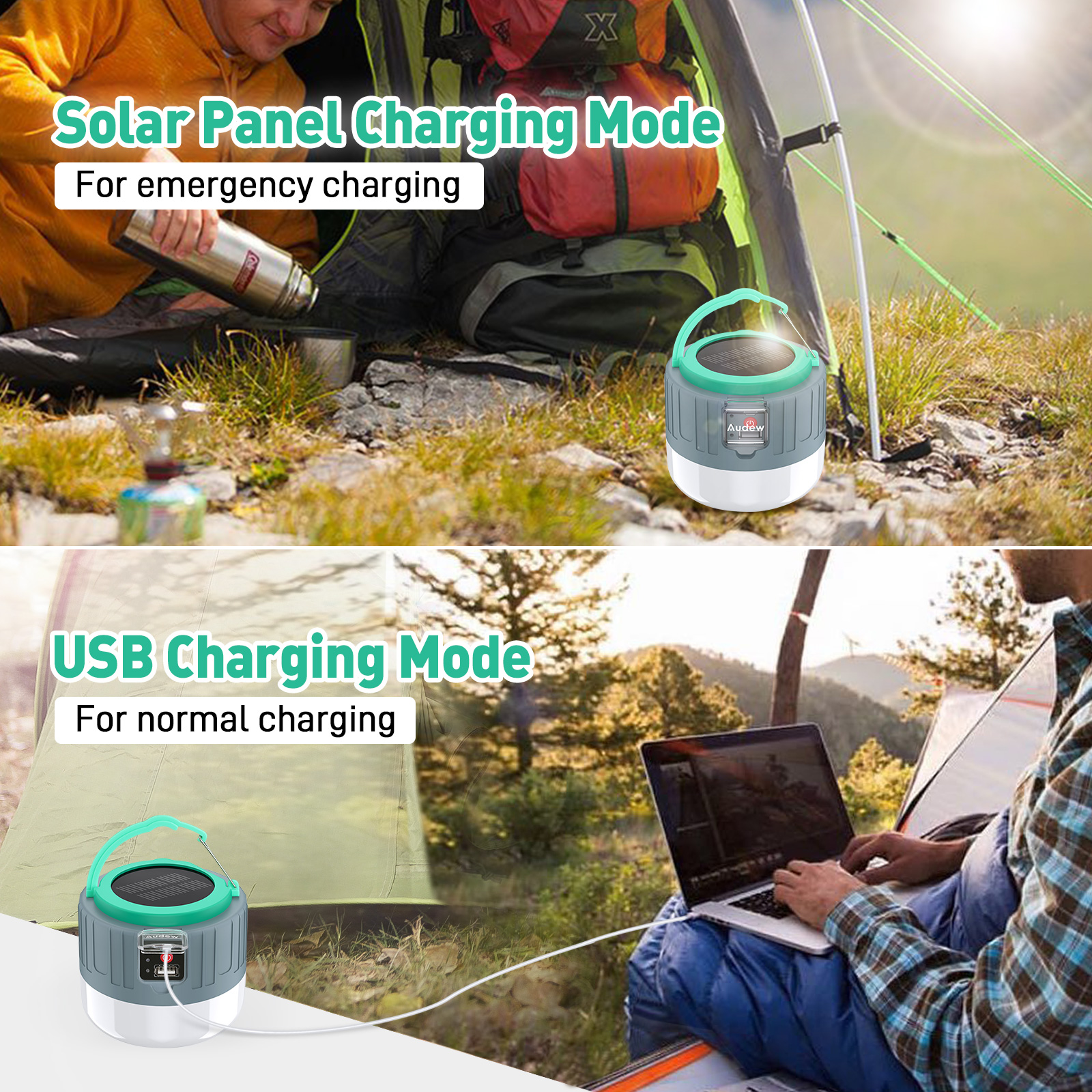 Audew camping lamp has two charging modes. Normally, you can use USB for charging. In emergency situations, such as power cuts or camping in the wild, solar panel can be used for charging. When charging with solar energy, the indicator light will light up.