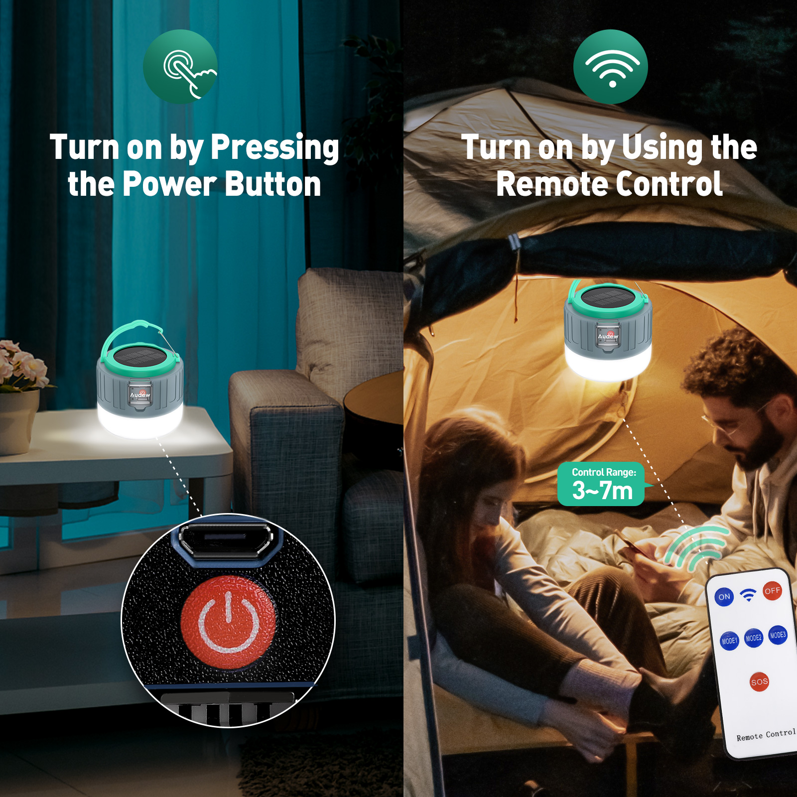 Audew camping lantern is equipped with a remote control, which can remotely operate the camping lights within a range of 5-10 meters. The remote control mode is convenient for you to operate the camping lantern when it is suspended or at a long distance. In addition, you can also manually operate it by pressing a button.
