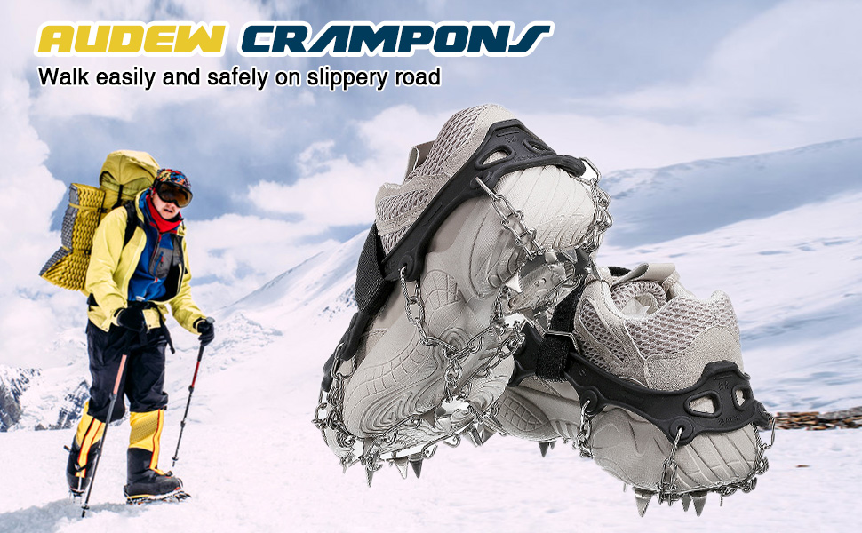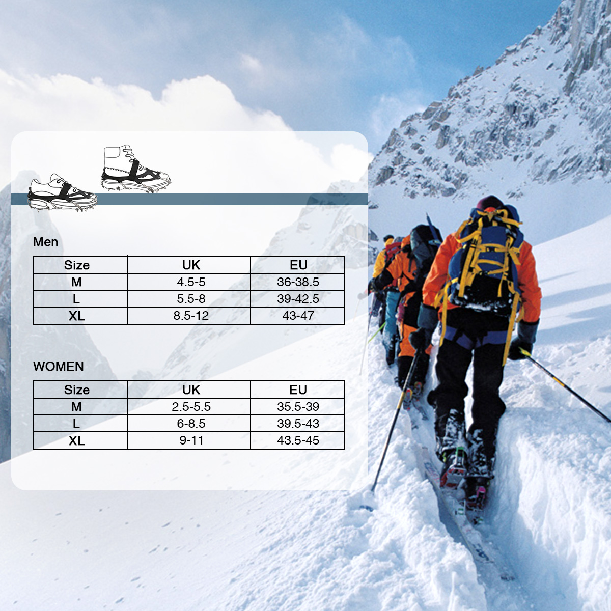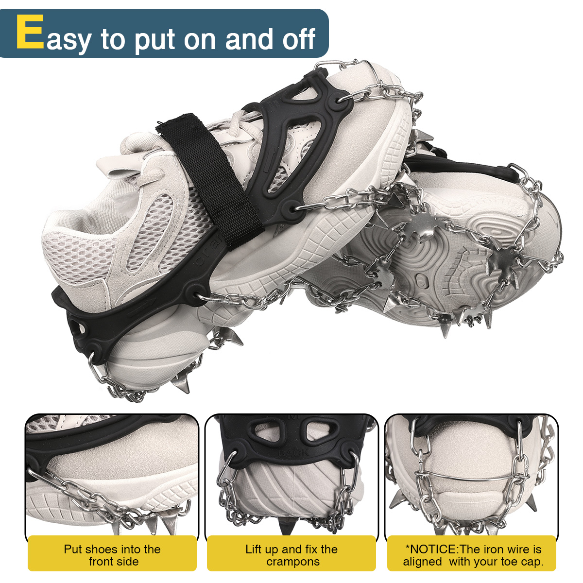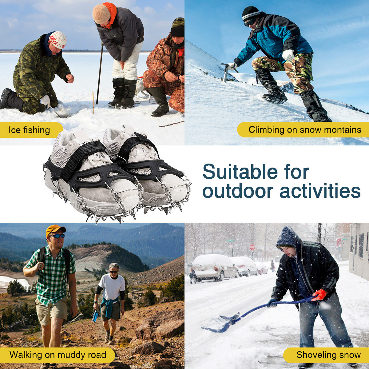 The 19 teeth crampons utilizes a tension fit system can fasten securely on any shoes and prevent move side-to-side for comfortable and  durable. Ensure that the crampons are more compact and safer to keep your safety and Injury-free on a slippery conditions. The crampons are fit for women and men, suitable for all kinds of outdoor shoes, such as hiking shoes, sports shoes, casual shoes, boots, dress shoes and so on.