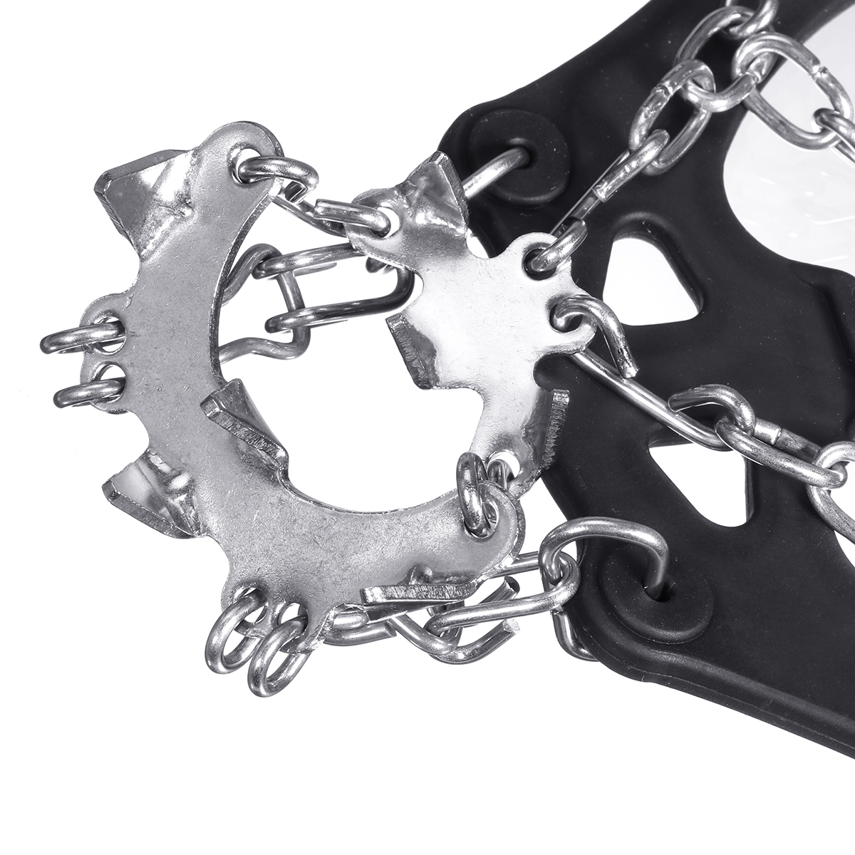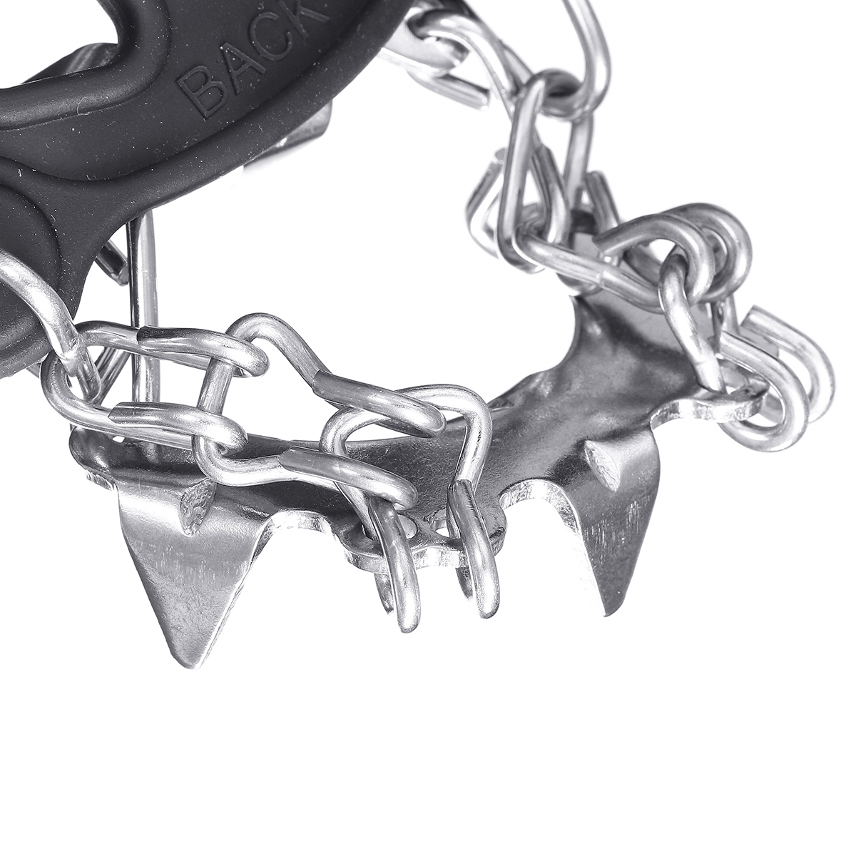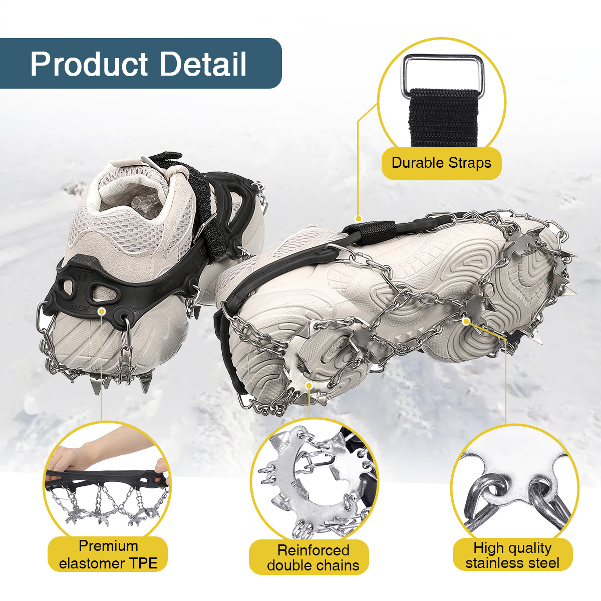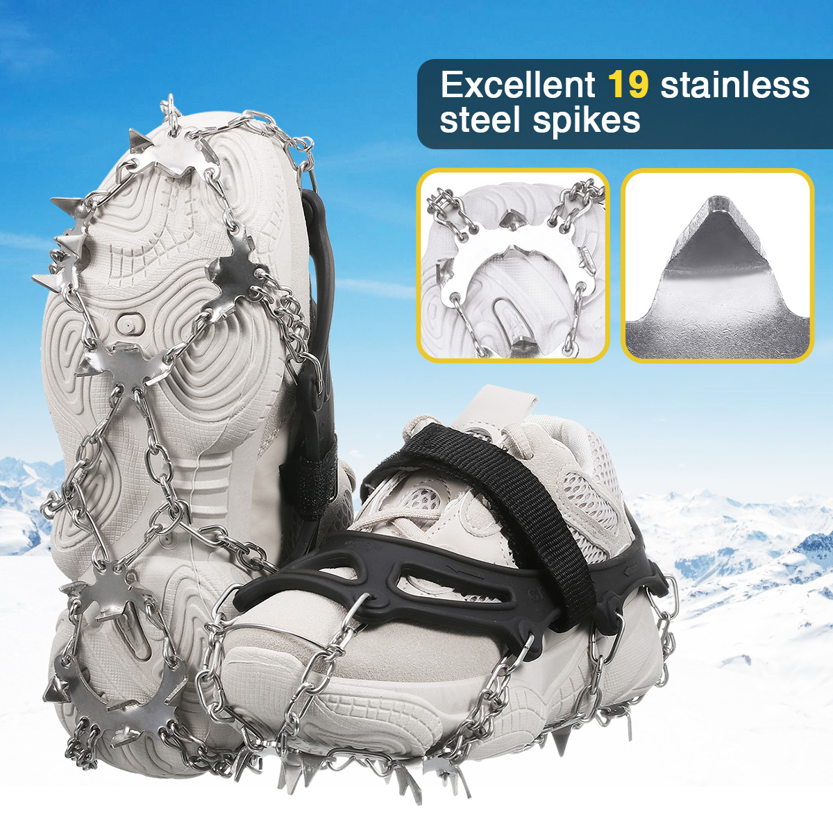 This crampons mainly made of super-elastic plastic, manganese steel jaws, a durable steel chain and a silicone rubber band to makes it never bend. The new upgraded 19 teeth crampons with better traction and grip and also is of flexibility, anti-abrasion ensuring that your shoes are tightly held to reduce the risk of hurt from falls or slips. Suitable for use in icy, snow and slippery conditions.