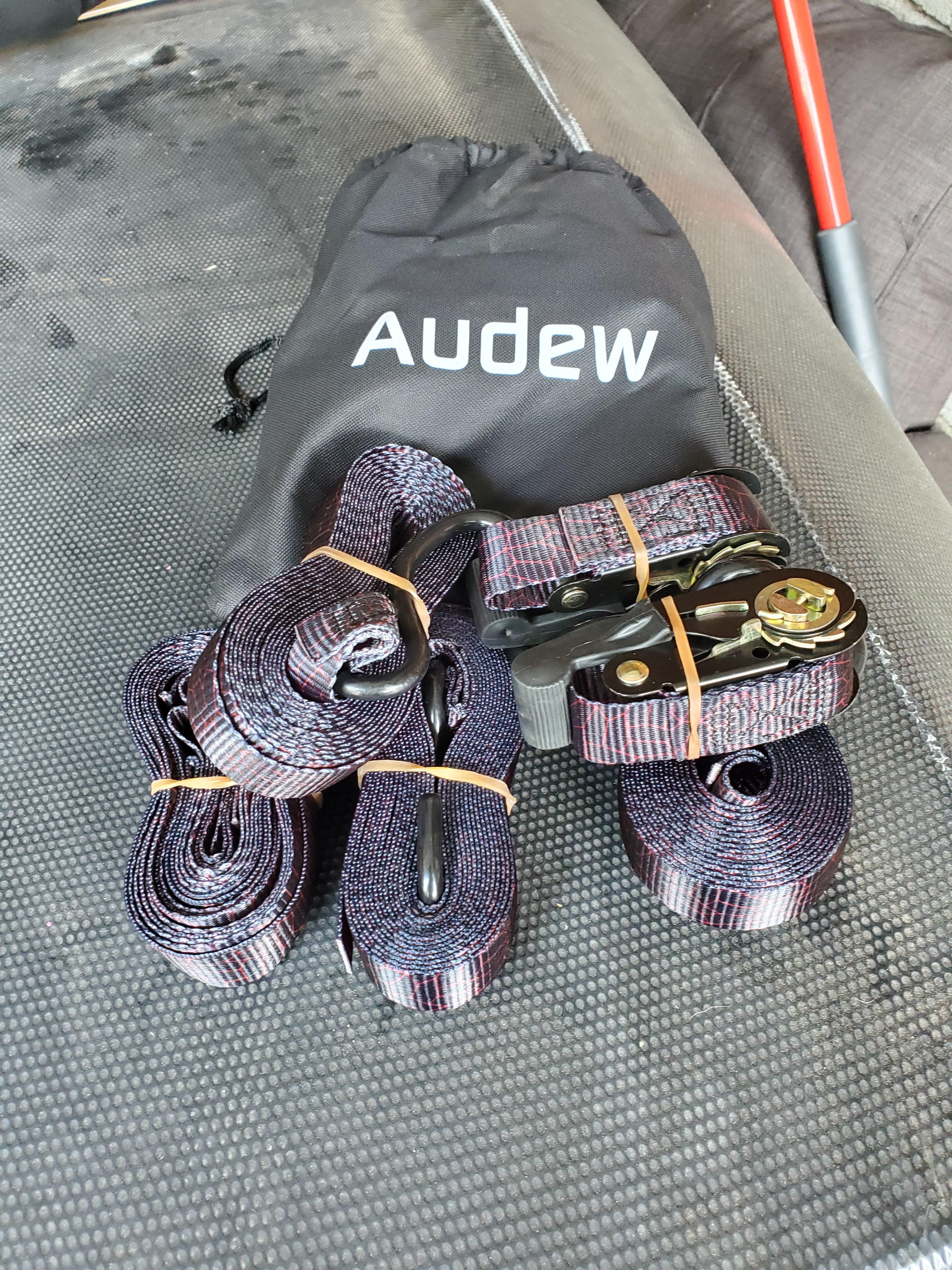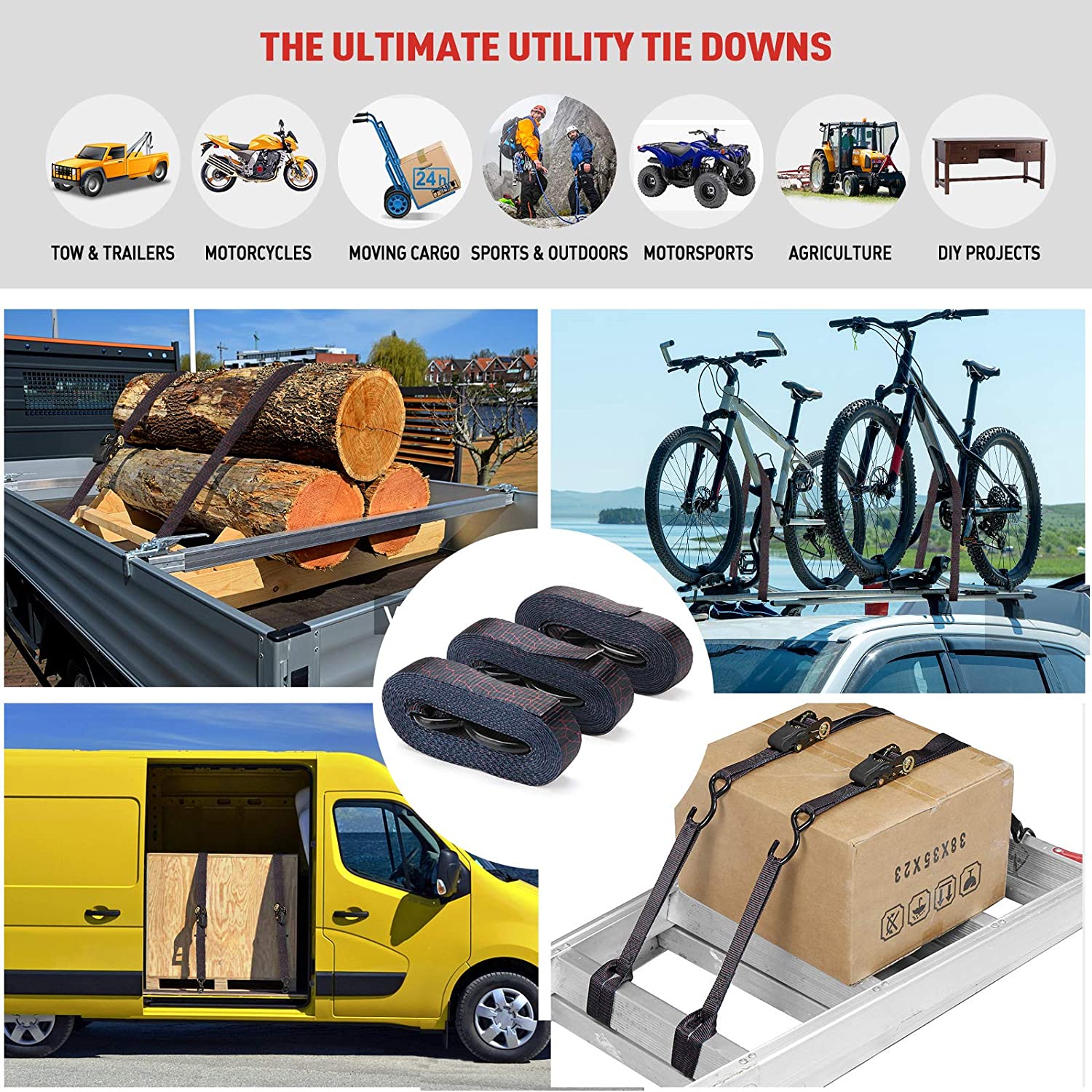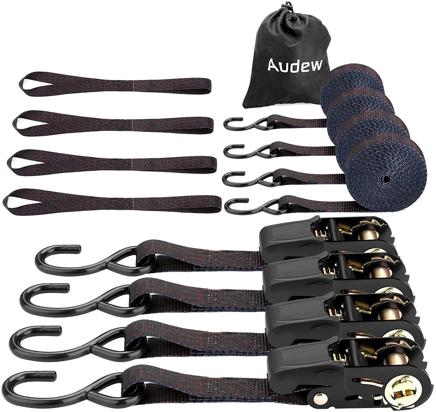 Audew ratchet straps kit is ideal for self-driving travel, outdoor, logistics, luggage straps, also can be used as a strap or tension band, binding and fixing cargo, camping, moving Appliances, widely used in towing, transportation, storage, and fixation for motorcycle, trailer, ATV, UTV.