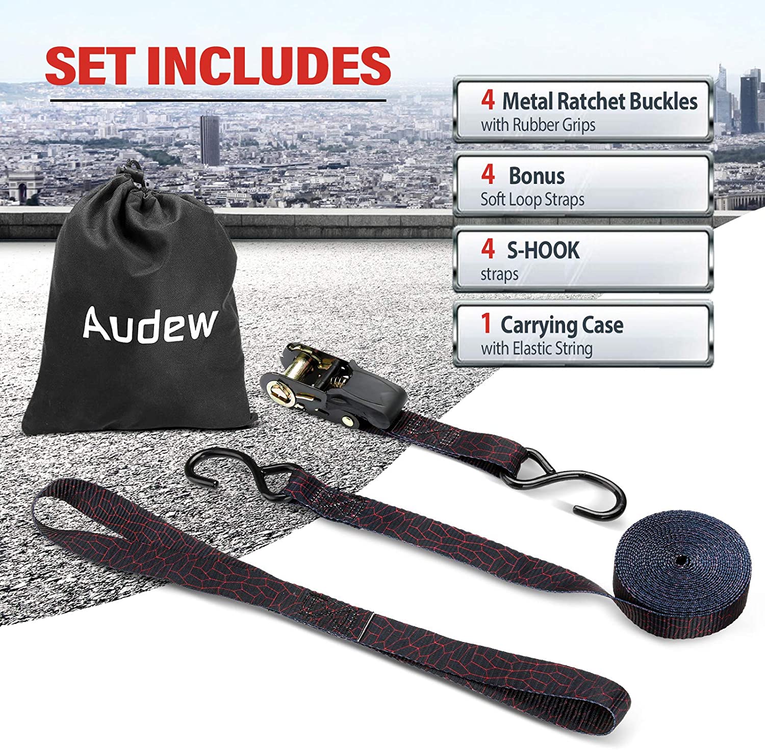 Audew ratchet tie-down straps are manufactured with top-rated industrial-grade material for complete cargo security. Anodized Ratchet, tough but pliable loops prevent cargo from scratch or marks.