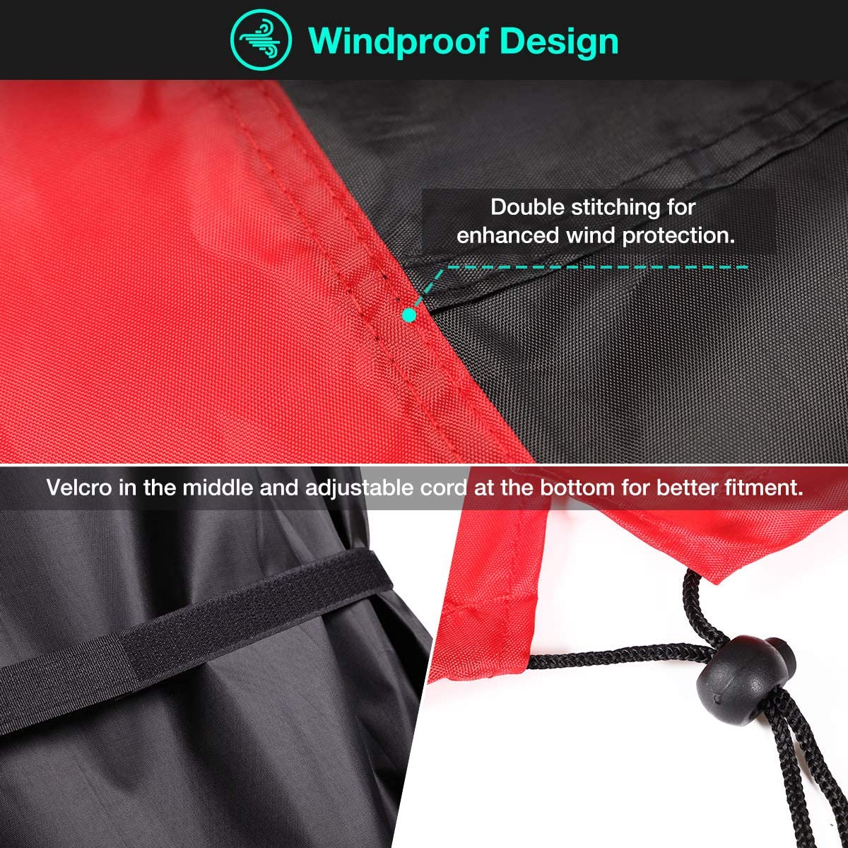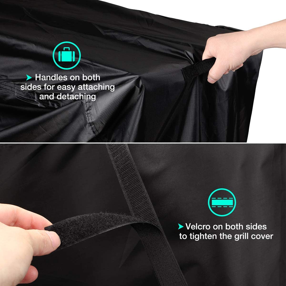 -Adjustable velcros in the middle , and adjustable cord at the bottom,tightening the cover on the grill.