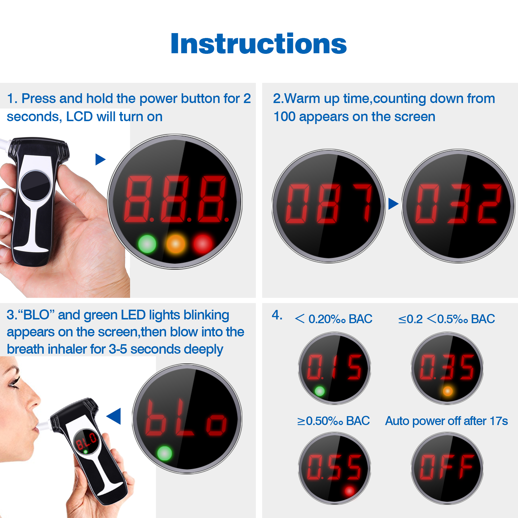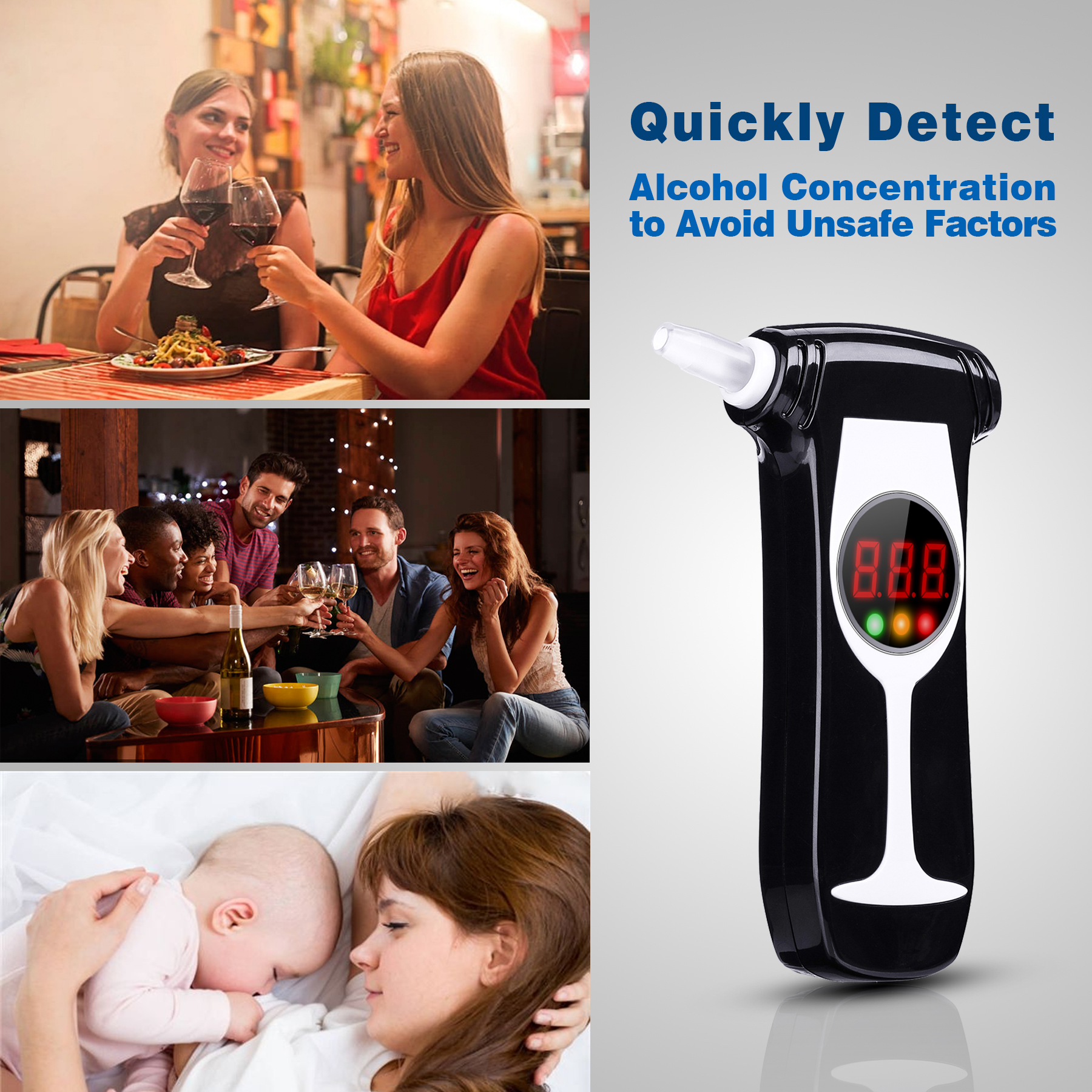 • Lightweight and Portable  The size breathalyzer is 112 * 55 * 21mm with 5 disposable nozzles. It is portable enough to be your party and dinner companion.