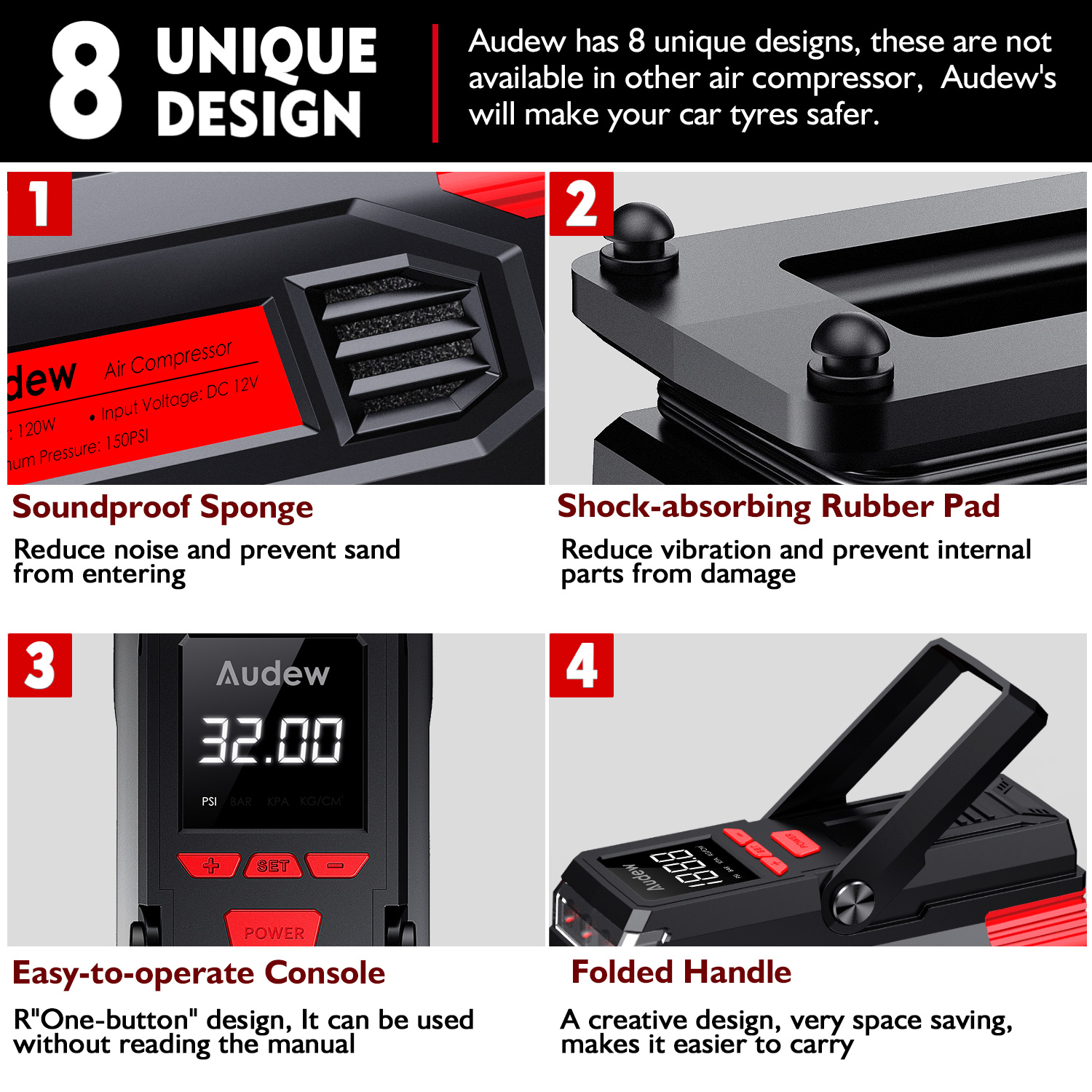 All you need to do is set the figure of tire pressure you need, Audew tire inflator will do all the work and then shut down automatically in a few minutes. Even if you have never used an air compressor, you can still use it well.