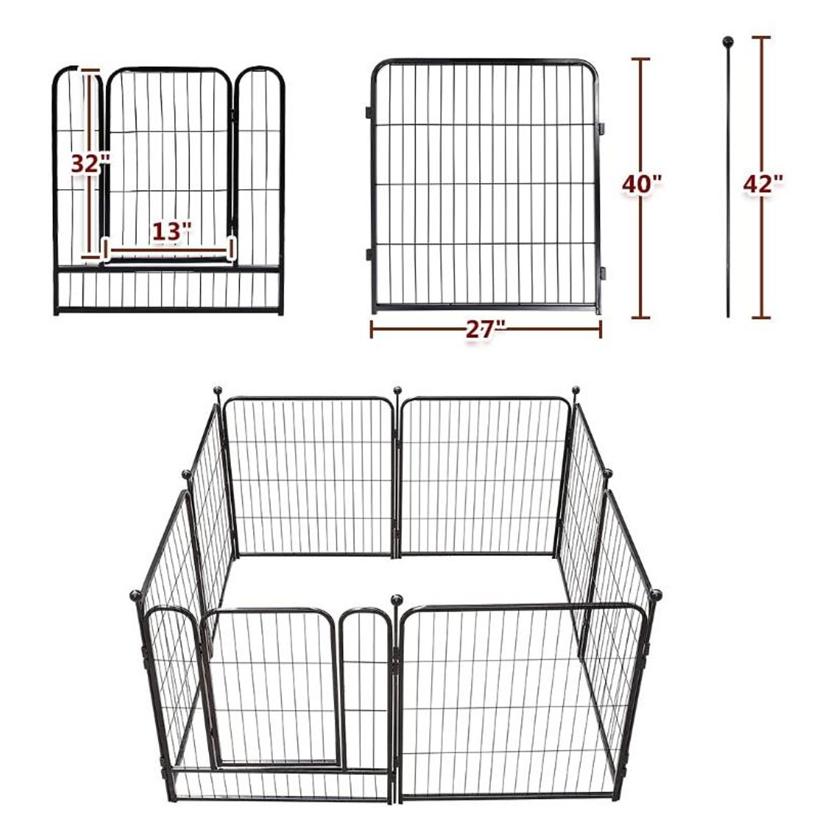 Specifications Color: Black Shipping Weight:30.9lbs Size: 39.4H x 26.7W Inches(per panel) Material & Process: Iron Pipe with Paint Process Package Includes 8 x Pet Fence Panel ( un-assembled ) 1 x Instruction - Safety Is The Highest Priority. Anti-Collision Ball Type Design on the top of each poles. 40 Inches Extra Tall.We want our dog friends not run around but we do not want to hurt them. Jumping out of the fence is the nature of each dogs. When dogs try to jump out of the fence, they may succeed and run outside the house. They may hit the fence so that the fence collapsed and overwhelmed themselves. Both of these situations are very dangerous. So a fence that is high enough and stable is very important. Rubber Bottom Gasket. Rubber can protect the floor while increasing friction with the ground. Can avoid the entire dog pen easily pushed by the dog. But if you want the dog pen to be more stable when used indoors, it is recommended to place it on the mat as much as possible. Need to install, please follow the installation instructions provided, the correct installation can make your dog playpen more stable. If you have any installation problems, please contact us. Frequently Asked Questions Q: Can I buy additional panels to add on and make it larger A: You can buy two and make it twice the size.